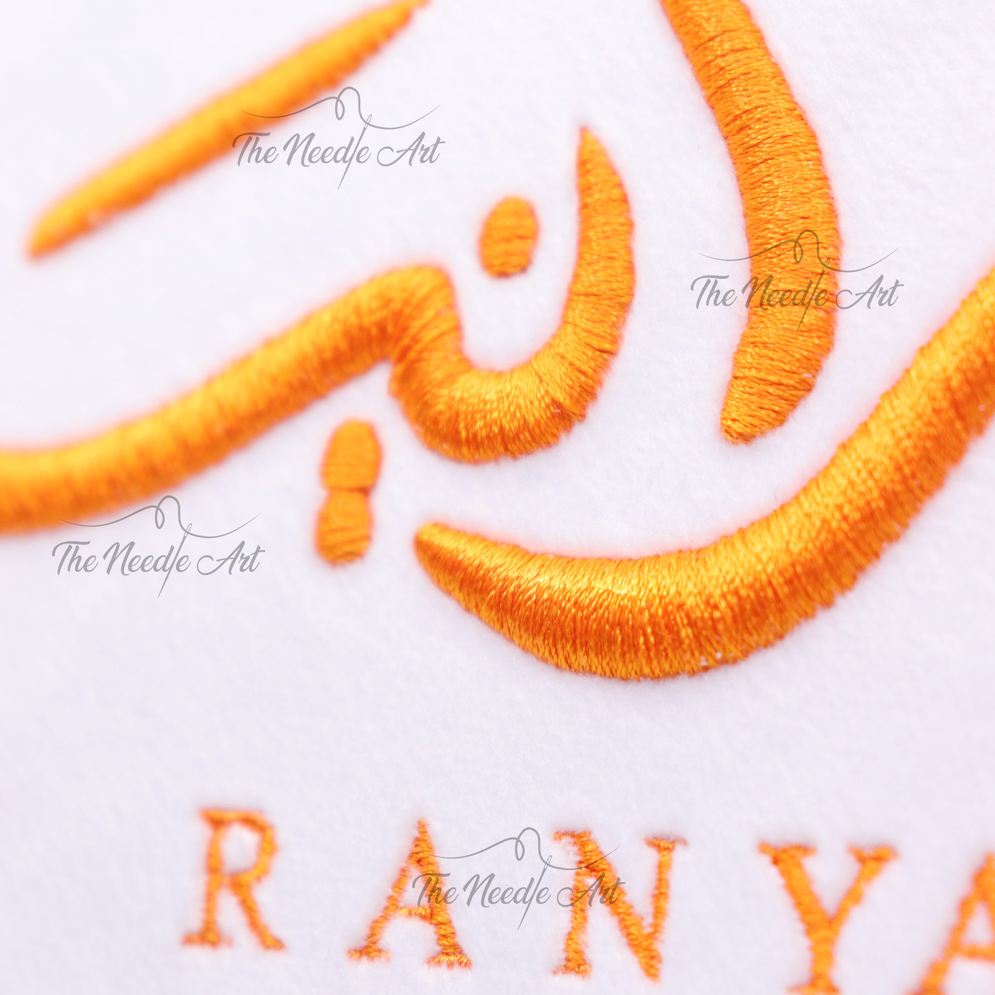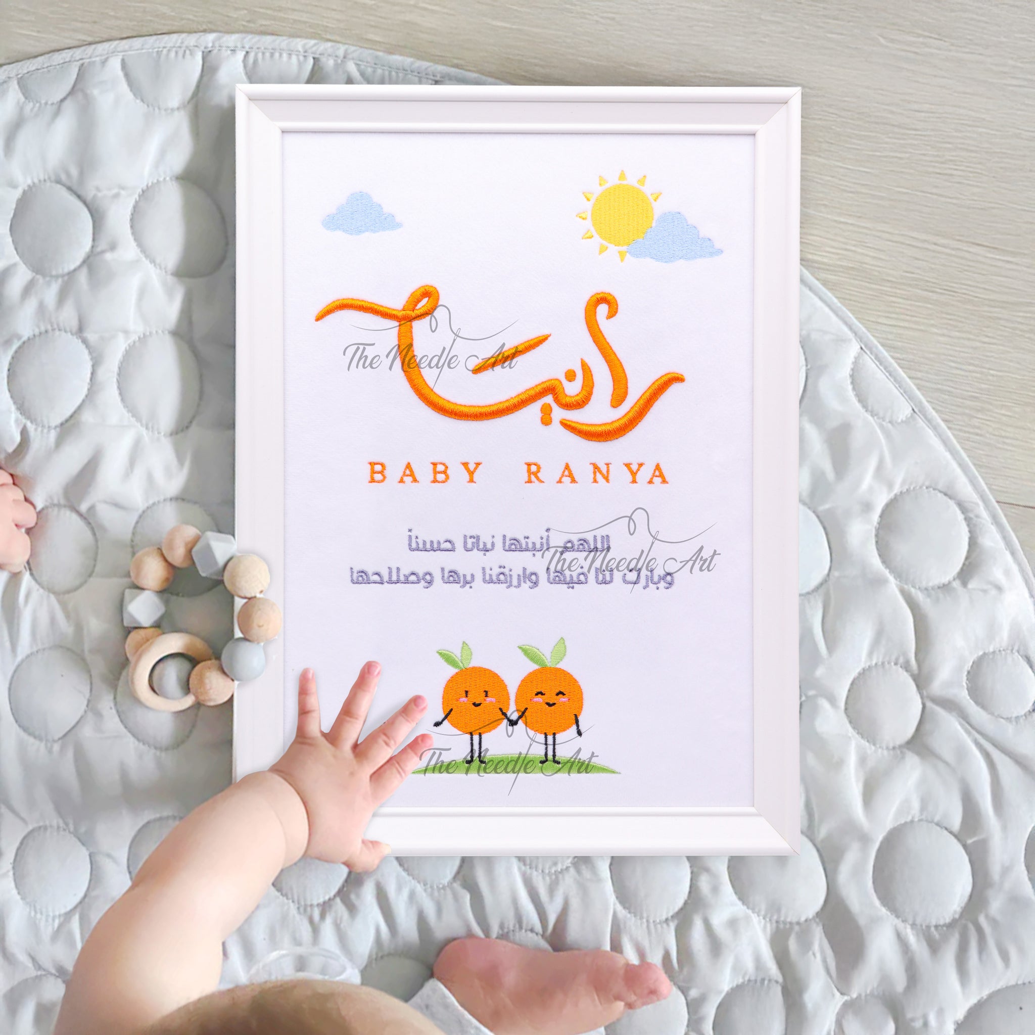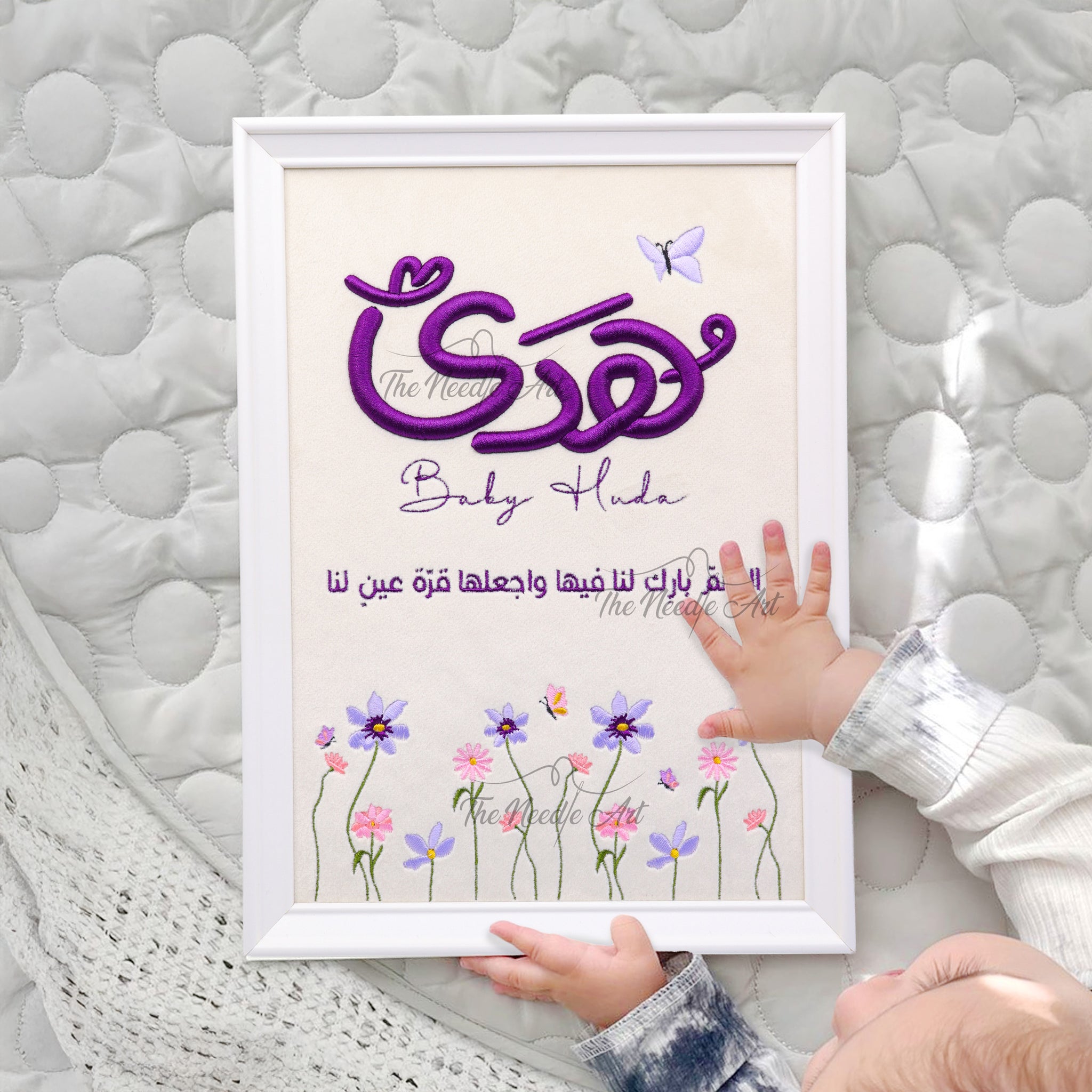 - تطريز اسم المولود بالخط العربي بتطريز ثلاثي الأبعاد بتصميم مستوحى من ثيم استقبال المولود